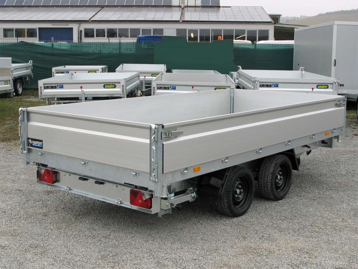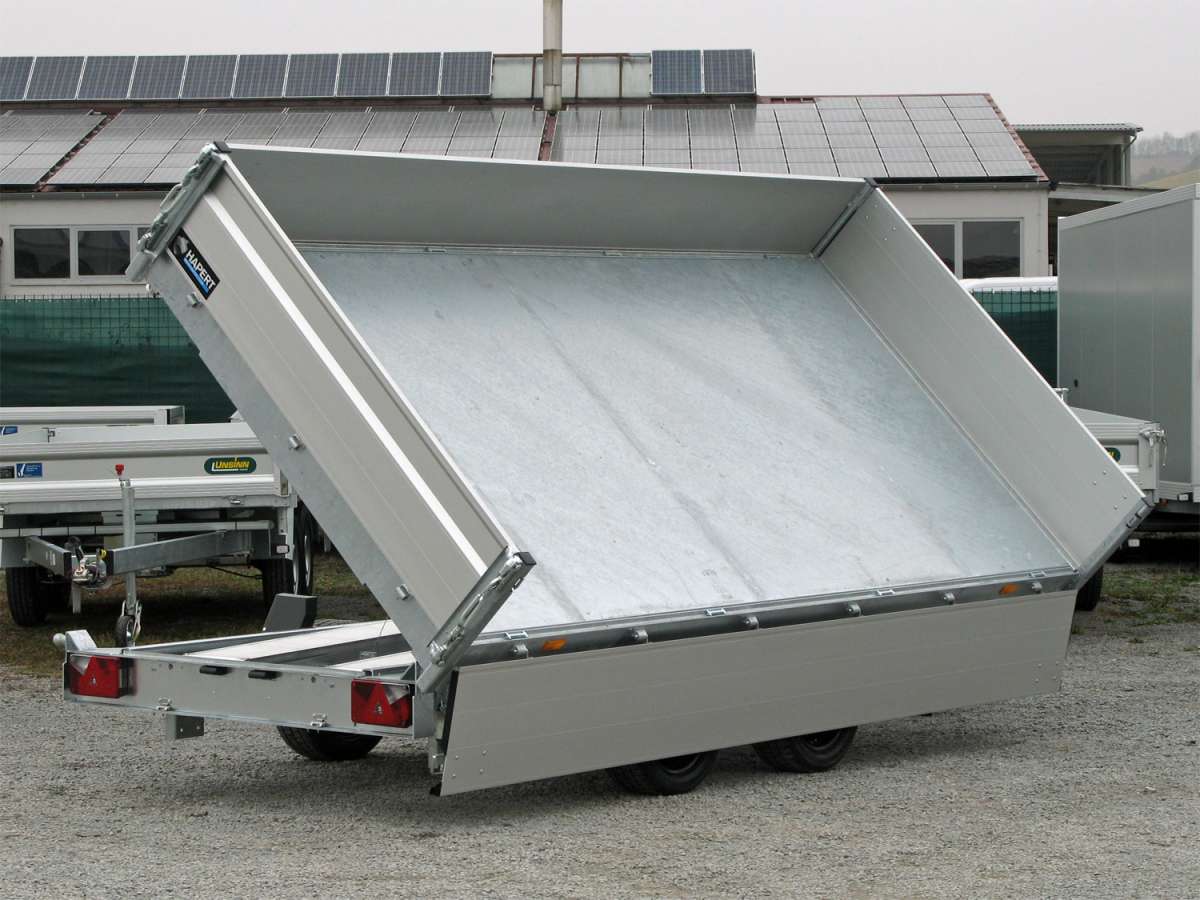 Benne basculante FERRO à trois voies avec ridelles rabattables en aluminium de 40 cm, comprenant une rampe de chargement, une alimentation électrique par batterie avec pompe manuelle de secours et chargeur.