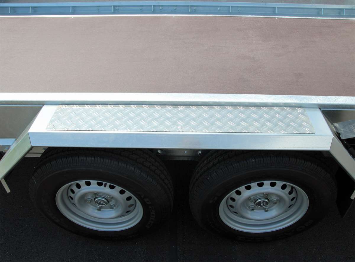 • Deux rampes de chargement en aluminium pliables, réglables et pivotantes latéralement, avec support de sol intégré et une capacité de charge de 3500 kg/paire