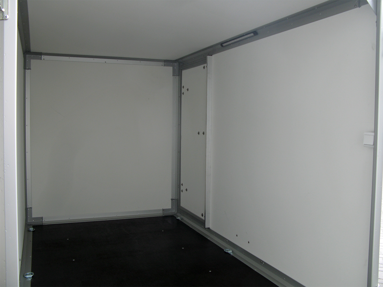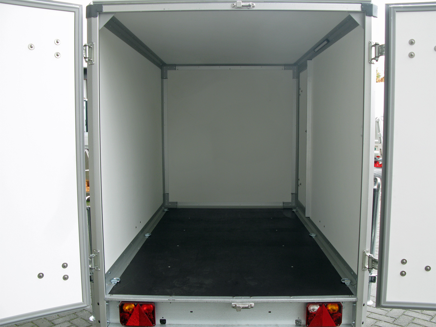 La remorque est équipée de deux portes arrière verrouillables, offrant un accès facile et sécurisé à son vaste espace de chargement. L’éclairage intérieur (LED 12 volts) et les six anneaux d’arrimage facilitent le chargement et l’arrimage, même par faible luminosité. Pour une plus grande flexibilité, une rampe arrière peut être ajoutée en option, simplifiant le chargement d’objets lourds ou roulants. Des rails d’arrimage supplémentaires sont également disponibles pour optimiser l’arrimage du chargement pendant le transport.