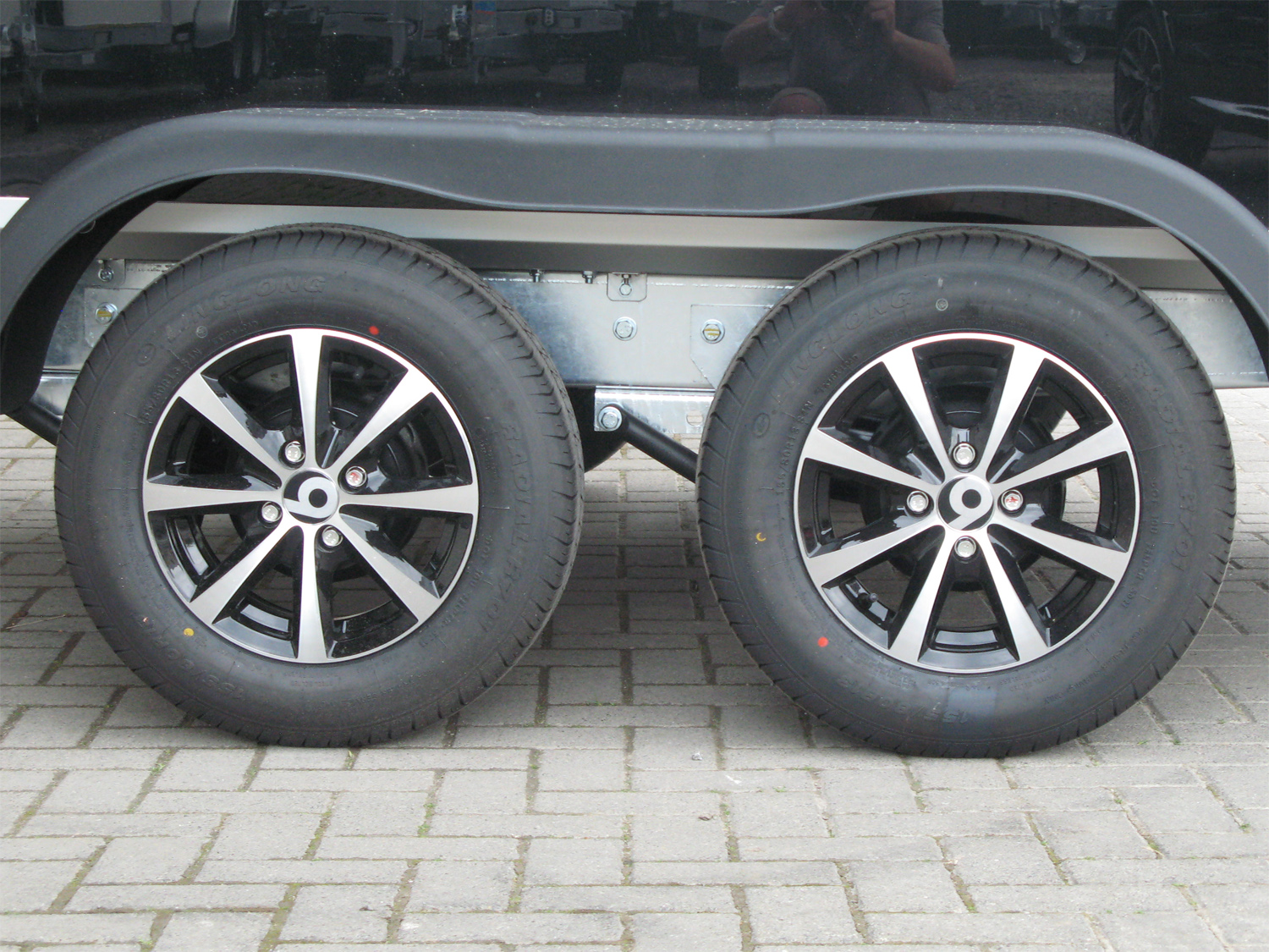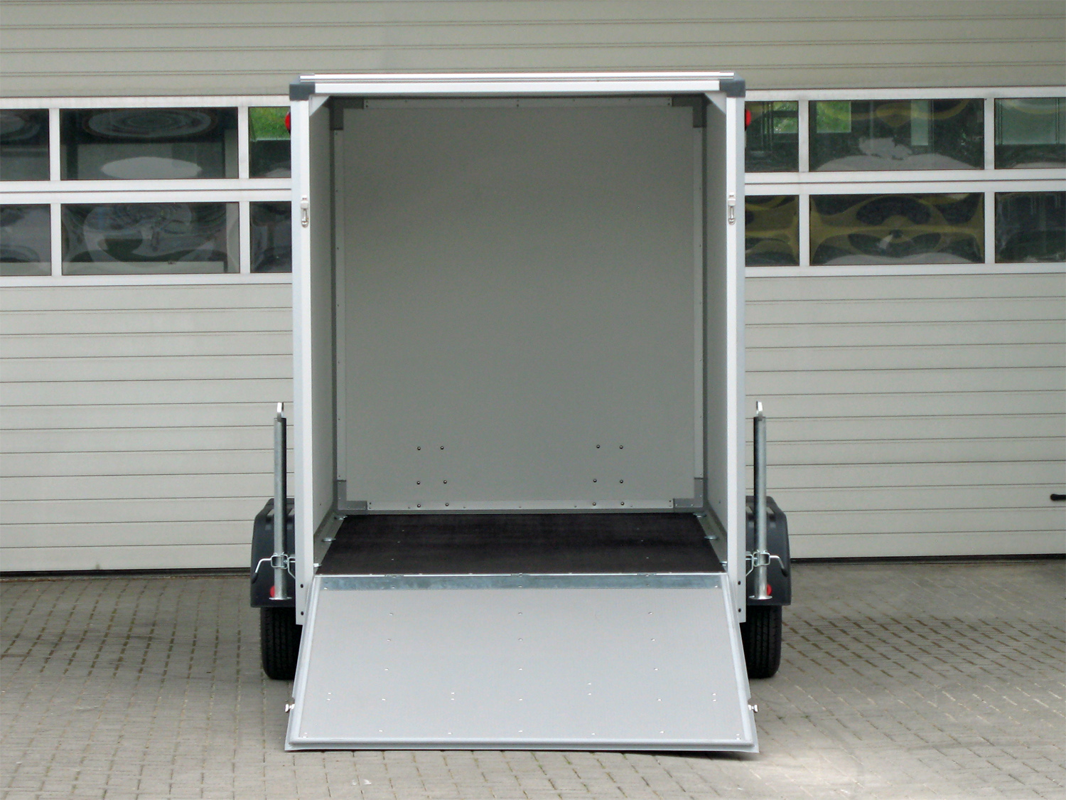 La remorque est équipée de deux essieux et les roues sont montées latéralement sur le châssis, ce qui assure une stabilité optimale, même avec des charges importantes. Le plancher et les côtés sont en contreplaqué durable, garantissant une longue durée de vie et une grande résistance à une utilisation intensive. Six anneaux d’arrimage internes permettent de sécuriser le chargement pendant le transport.