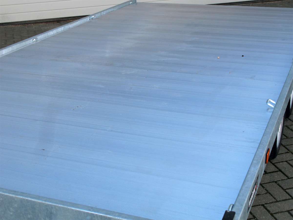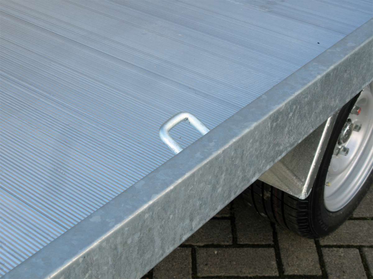 plancher robuste en aluminium de série ! Rampes de chargement dans un compartiment verrouillable sous le plateau de chargement, nombreux anneaux d’arrimage (extensibles latéralement et soudés aux angles).